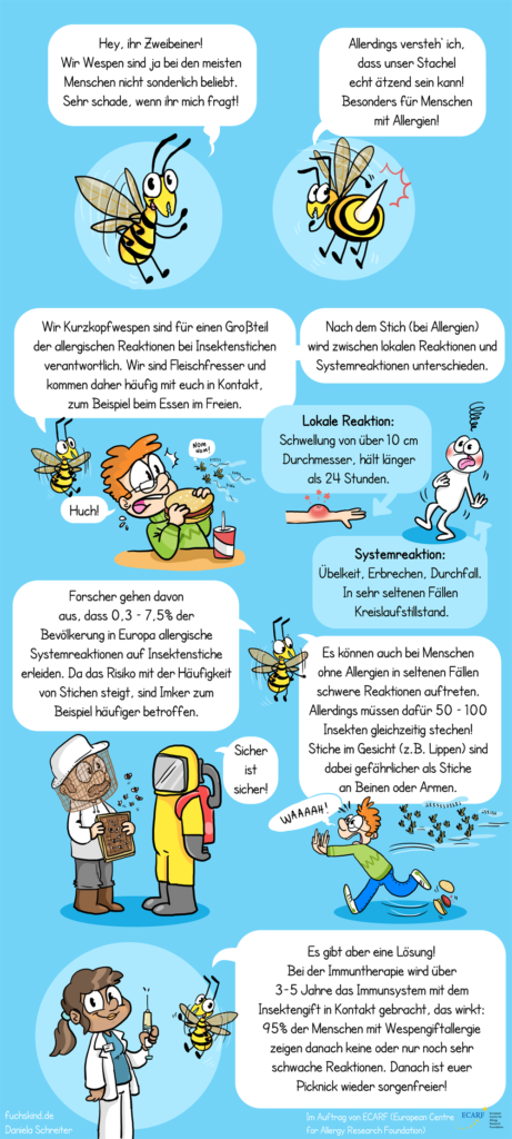 Biene, Wespe und Co. werden in den Frühjahrs- und Sommermonaten nicht nur von Allergikern mit gebührendem Abstand beobachtet. Ein Stich der so genannten Hautflügler (Fachbegriff: Hymenoptera) löst auch bei Menschen ohne Allergien an der Stichstelle eine schmerzhafte Schwellung und Juckreiz aus. Bei Menschen mit Allergien aktivieren die im Gift enthaltenen Eiweiße zusätzlich das Immunsystem.