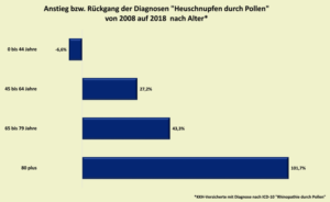 War die Pollensaison früher vor allem für Kinder und Jugendliche ein Problem, treten heute Beschwerden zunehmend erst im späteren Erwachsenenalter auf. Bei den KKH-Versicherten zeigte sich bis zum 45. Lebensjahr ein leicht rückläufiger Trend bei den Pollenallergien. Dagegen litten in der Altersgruppe von 65-79 Jahren fast 50 Prozent mehr Menschen an Heuschnupfen als noch vor zehn Jahren. Bei der Generation 80 plus hatte sich die Häufigkeit sogar mehr als verdoppelt.