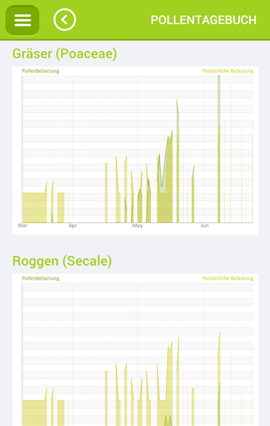 - Das integrierte Pollentagebuch ist sehr gut aufgebaut, es kann eine professionelle Diagnose und Therapie sinnvoll begleiten. Daten lassen sich auswerten und exportieren. Wer regelmäßig seine Belastungsdaten in die App eingibt, erhält individualisierte Pollenvorhersagen.