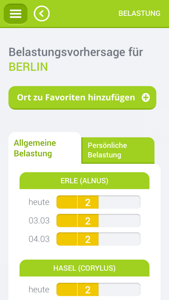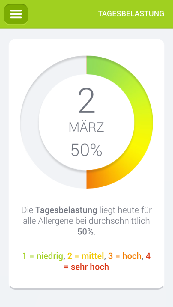 - Die angezeigte Tagesbelastung ist eine schöne Begrüßung beim Start der App. Aber es ist fraglich, ob die Informationen für die Nutzer überhaupt brauchbar sind: Immerhin werden die Daten aller Allergene zu einer Tagesbelastung zusammengefasst. Wer also auf bestimmte Pollen nicht oder besonders stark reagiert, wird hierbei in die Irre geleitet.