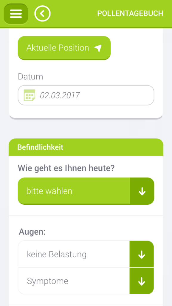 Im Menüpunkt Beschwerden ist das Pollentagebuch hinterlegt. Das Tagebuch ist ausführlich und hilfreich bei einer professionellen Diagnose und Therapie. Allerdings ist hierfür eine Anmeldung mit einem eigenen Benutzerkonto notwendig. Beim Anlegen des Profils auf pollendiary.com werden auch einige wichtige Fragen zum Stand von Diagnose und Therapie gestellt. Dann geht es los: Die tägliche Pollenbelastung wird mit der allgemeinen Befindlichkeit und Beschwerden von Augen, Nase und Lunge abgeglichen. Das ermöglicht individualisierte Vorhersagen in der App. Einige wichtige Funktionen des Tagebuchs sind jedoch nur über pollendiary.com nutzbar.